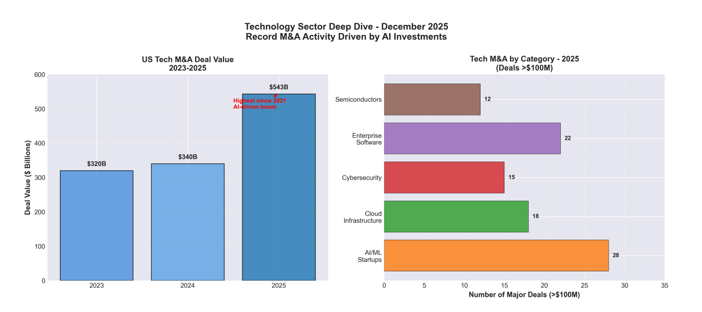 The technology sector was the epicenter of market activity this week, driven by an unprecedented M&A boom that has redefined the competitive landscape. Total US tech M&A deal value for 2025 has soared to $543 billion, the highest level seen since the market peak of 2021 and representing a staggering 60.2% year-over-year increase [1]. The global figure is even more striking, with technology dealmakers hitting a $1 trillion record amidst the AI gold rush [2]. This frenetic pace of dealmaking underscores a fundamental strategic imperative: the acquisition of AI talent and technology is no longer a luxury but a critical component of corporate survival and growth.