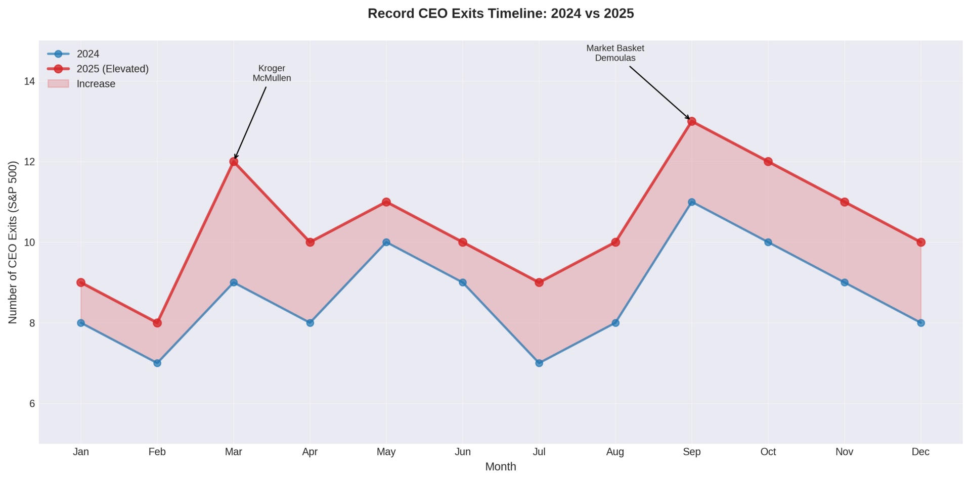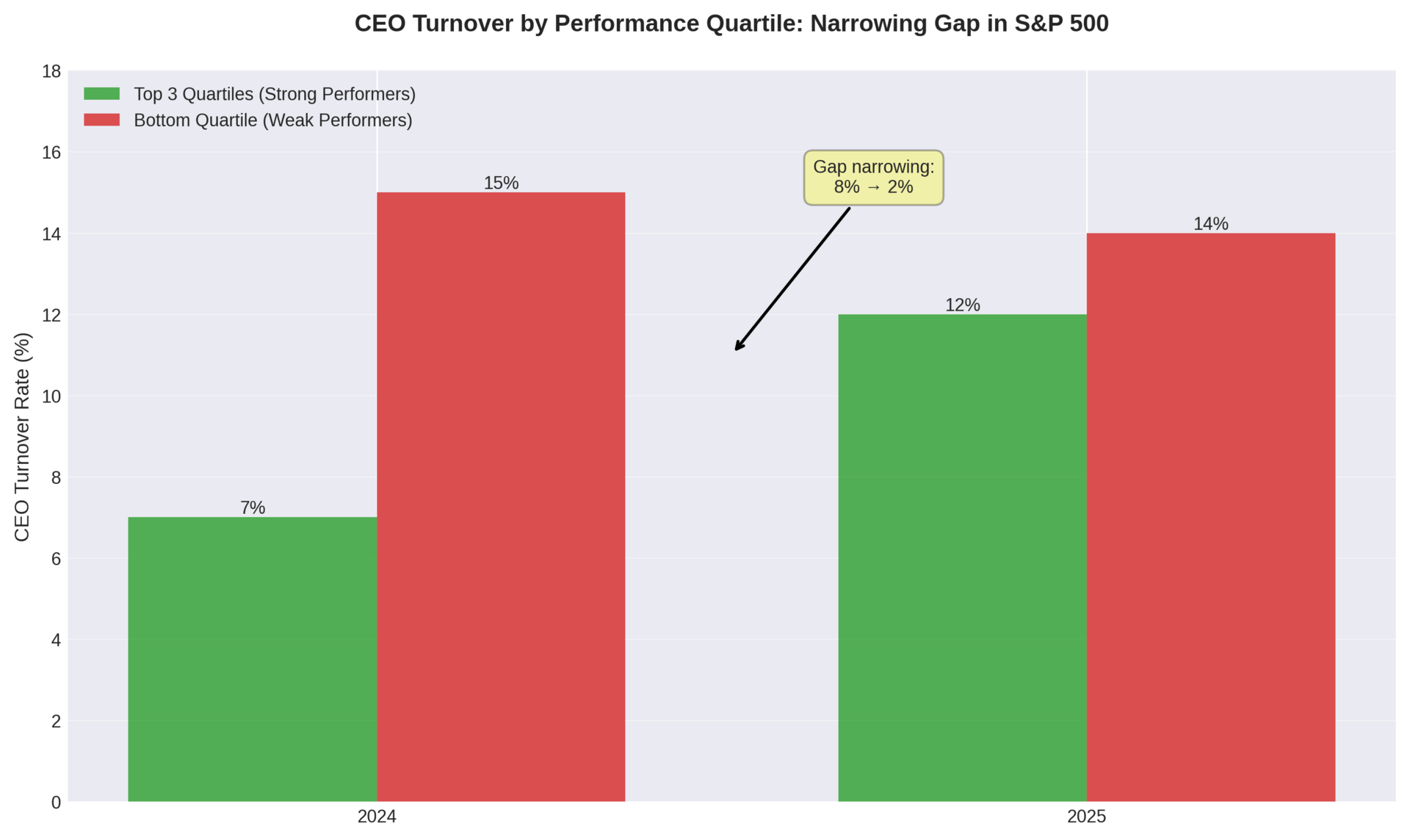 The overarching theme of 2025 has been a great recalibration in corporate leadership. After years of navigating pandemic-related disruptions, boards are now acting with greater confidence, advancing planned successions and making strategic leadership changes to position their companies for the future. Data from The Conference Board reveals that CEO turnover in the S&P 500 surged to a projected 13% in 2025, a significant jump from 10% in 2024 [8]. This acceleration is not merely a function of poor performance. In a striking departure from historical norms, the gap in turnover rates between the highest and lowest-performing companies is narrowing dramatically. CEO succession at top-quartile performers (by total shareholder return) jumped from 7% in 2024 to 12% in 2025, just shy of the 14% turnover rate seen at bottom-quartile firms [8]. This suggests that boards are increasingly proactive, making changes to align leadership with new strategic imperatives rather than simply reacting to poor results.