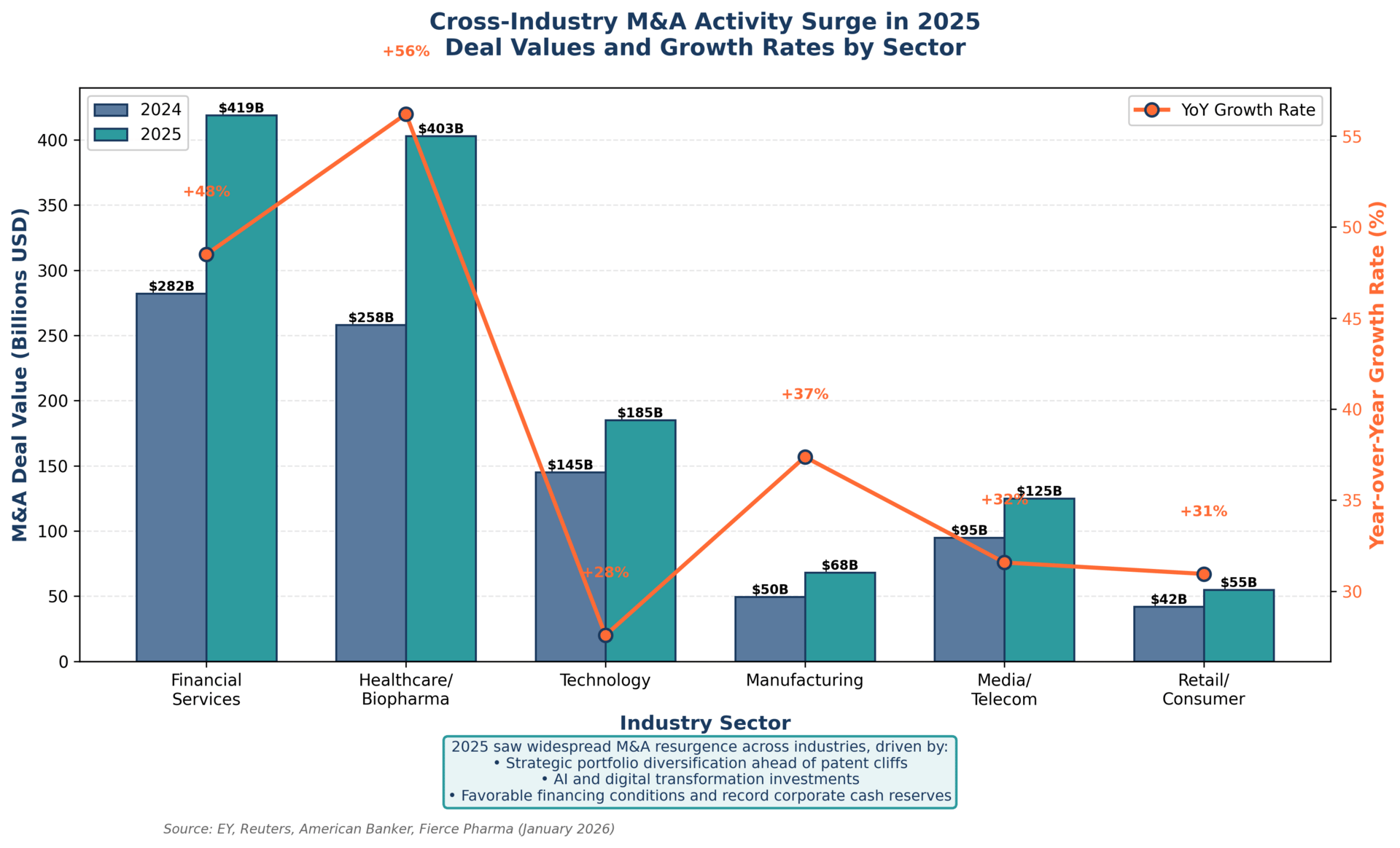 The healthcare sector has seen a significant rebound in M&A activity, with deal volume rising 56% year-over-year to an estimated $403 billion in 2025 [4]. While the number of transactions fell by 8%, the increase in deal value indicates a trend towards fewer, but larger, strategic acquisitions. This resurgence is driven by looming patent expirations, a thawing biotech investment scene, and the availability of significant M&A firepower, with life sciences companies holding an estimated $2.1 trillion in available capital [5].